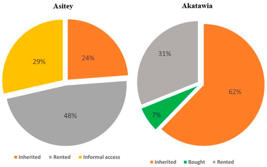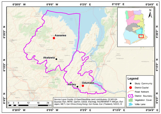 The study was carried out in two villages—Asitey and Akatawia—in the Eastern Region of Ghana. The relatively less rural Asitey (Lat. 6.129601°, Lon. −0.013253°) is less than a kilometre from Odumase, the municipal capital of the Lower Manya Krobo Municipality, while the relatively more rural Akatawia (Lat. 6.283055°, Lon. −0.128794°) is about 9 kilometres from Asesewa, the capital of the Upper Manya Krobo District (Figure 1). In terms of climate, both study sites are located in the Semi-Equatorial climatic belt of West Africa with similar mean annual rainfall values. As such, both locations experience the bimodal type of rainfall with the major rainy season falling between March and early August, while the minor one falls between September and late October. Thus, biannual crop cultivation is often practised with longer and shorter rainy seasons coterminous with the major and minor farming seasons. Apart from the wet season, the region also experiences a dry season, the Harmattan, between November and March. With regards to agro-ecology, both study sites are located in the moist Semi-Deciduous forest zone.