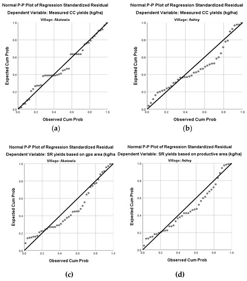 Normal probability-probability plot of regression residuals showing deviations CC and SR yields at both Akatawia and Asitey: (a) normal p-p plot of regression residuals for Akatawia using crop cut yields as dependent variables; (b) for Asitey using crop cut yields as dependent variables; (c) for Akatawia using farmers’ self-reported yields as dependent variables; (d) for Asitey using farmers’ self-reported yields as dependent variable.