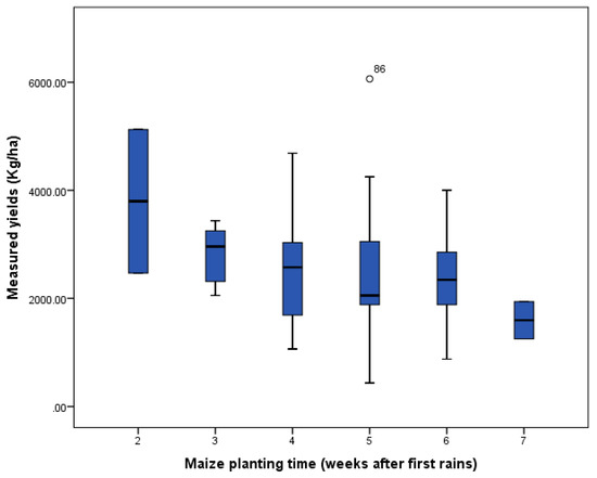 Boxplot showing the relationship between timing of maize planting in weeks after the first rains and CC yields.
