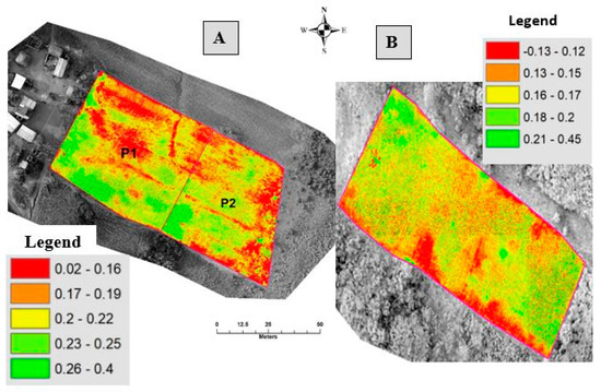 Significant within-plot variability in crop vigour at both study locations. NB: Sample plots A (in Asitey) and B (in Akatawia) were surveyed at 7 and 6 weeks after sowing, respectively. The density and intensity of vegetation present is used to assess vegetation vigour so that the healthier the vegetation, the greener the pixels and vice versa. Thus, the spectrum ranges from 0 to ~0.16 μm for bare lands/soils, and ~0.17 through ~0.45 μm for various levels of vegetation vigour. Based on theory and ground-truthing, maize crops typically fall between ~0.20 and ~0.30 μm (light green pigment) with those above this threshold corresponding to tree canopies and secondary vegetations.