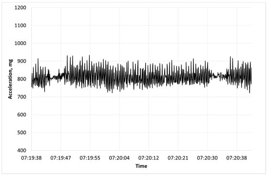Rumination signatures are identified through small movements in the neck muscles of animals that accompany the jaw motion during chewing [7,8]. Figure 2 shows an illustrative example of a rumination measurement (from 07:29 h to 07:31 h); acceleration signals are centered on 800 mg and indicate the orientation of the device with respect to gravity, i.e., 1000 mg (or 1 g), indicating perfect alignment with the direction of gravity, whilst 0 g indicates that the accelerometer is orthogonal to the gravity vector. Variations in acceleration due to the jaw motion that accompanies rumination are significantly smaller, in the range of ±50 mg.