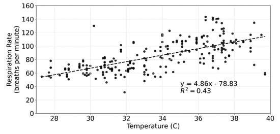 The RRs for the observed cattle were correlated with temperature (Figure 6) and the Temperature Humidity Index (Figure 7).