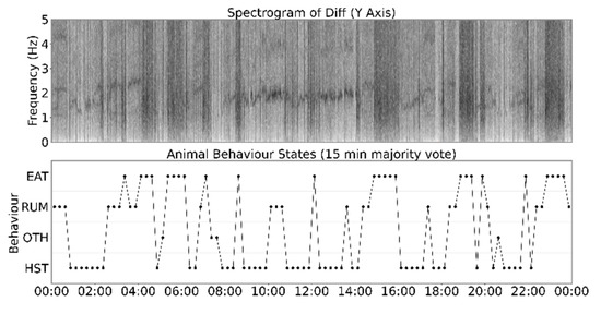 An illustrative measurement of the use of the data to predict heat stress is shown in Figure 8 for a single cow. The data shows a Short-Term Fourier Transform (STFT) over the period of one day along with associated classifications. The STFT was evaluated over a 90-s block, sufficiently long to identify rumination periods with the lower section of Figure 8 showing the classifications generated over time. Classifications are aggregated into blocks of 15 min and a majority vote is used to identify the predominant class. The process for extracting feeding, rumination and other behaviours is described [30]. Here, the focus is on identifying heat stress. Rumination was distinguished from respiration rate on the basis that the higher order frequency components were stronger viz. the peak in the range 2–3 Hz being greater than that in 1–2 Hz. In addition, in the case of the respiration signal, harmonics of the fundamental frequency do not exist.