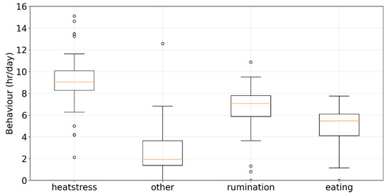 Figure 9 displays boxplots of activity budgets for the 10 cattle under observation over the month of July for eating, ruminating, ‘other’ and heat stress. The times spent exhibiting signs of heat stress are significant and are comparable with durations of eating and ‘other’, where the latter classification representing all activities that are not eating, ruminating or heat stress. Results indicate that cattle exhibit significant periods of time during the day where their RR exceeds 60 bpm.