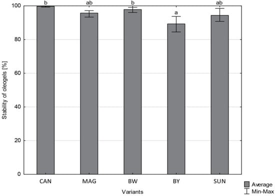 In order to check the durability of rapeseed oil binding by gelling agents, a centrifugal test was carried out. The organogels set in rotation were separated into two phases: liquid and solid–gel. The obtained results testify to the relatively high stability of the oleogel structures, which were obtained with a 5% addition of various structure-forming substances in rapeseed oil (Figure 1). Among the tested oleogels, candelilla wax and white beeswax samples proved to be the most durable systems for centrifugal force. They achieved stability of 99.67% for CAN and 97.80% for BW (Figure 1). Oleogel with BY had the largest leakage of the oil phase after centrifugation (89.30%). In turn, variants with SUN and MAG achieved stability that was not statistically different (at α = 0.05) from other organogels (Figure 1). Da Pieve et al. [33] for oleogel that was produced with 5%w/w monoacylglycerols, but in another solvent—cod liver oil—obtained about 20% loss of liquid fraction in the centrifuge test. The reason for the better stability of the MAG oleogel and the other structuring substances tested in rapeseed oil is the more than twice higher rotation speed used in the test by scientists (10,000 rpm) and 5 min longer time of the test.