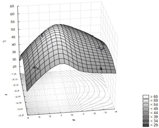 Analysis of the xyz chart of the dependence of the L* color parameters on a* and b* obtained by all rapeseed oleogels shows that the brightest color was reached by variants with a* values in the range from −2.7 to −2.3 and b* from 0 to 2 (Figure 2).