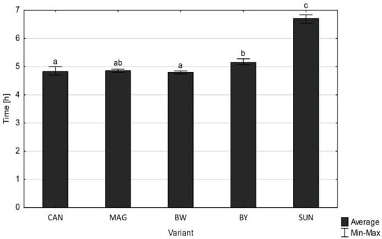 For all oleogels, the values of parameter a* were negative, which indicates a greater proportion of green hue (Table 3). The least intensity of this color was characterized by organogels with beeswax white (−2.19), sunflower wax (−2.39), and monoacylglycerols (−2.58). Variants with CAN and BY had the largest share of green. Similar results (negative values of parameter a*) were also obtained by other authors for organogels consisting of monoacylglycerols (3%, 7%, or 10% w/w) and hazelnut oil. The value of parameter a* for oleogel with 7% of MAG was −2.42 [34]. This value is 0.16 units smaller than that obtained for the variant with the same gelling substance but with a lower concentration and a different lipid solvent (Table 3).