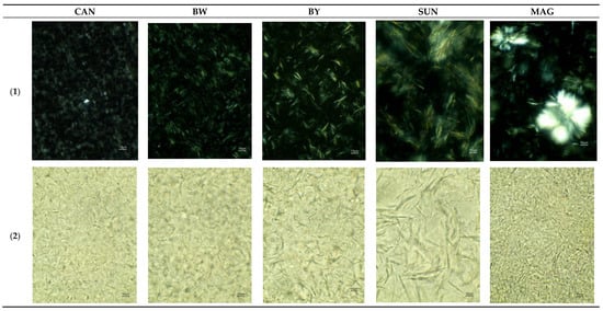 Both polarized light microscopy and sample observations in the bright field allowed the analysis of the internal structure of the oil gels (Figure 4). Its image depends, among others, on the type of gelling substance, temperature, and cooling time of the mixture [41]. The CAN variant had the shortest (on average 8.49 nm) and the most regularly distributed crystals compared to other organogels. According to Blake et al. [18], the chemical composition of candelilla wax predominates with hydrocarbons (up to 65%), including hentriacontane (C31H64) [40]. Other gelling substances, i.e., sunflower wax, monoacylglycerols, yellow beeswax, and white beeswax formed in rapeseed oil thin, much more elongated crystals that were the most visualized using the bright field technique (Figure 4). Their average lengths were 27.41 nm, 17.77 nm, and 10.09 nm, respectively (Table 4). According to Hwang et al. [42], esters (ES) are responsible for the morphology of crystals in the form of “needles” in a sample of SUN oleogel. They are the main component of sunflower wax, up to 100% [18]. It can be assumed that the structure-forming substance that was used was responsible for a similar picture of oleogels with beeswax (Figure 4). In the composition of beeswax, the ES content dominates over the other components [43]. Therefore, it can be said that the esters, which are part of the chemical composition of the above waxes, form “needle” networks of fatty crystals in structured oils. In the case of the variant containing monoacylglycerols, fat clusters were unevenly distributed in the tested sample (Figure 4.2).