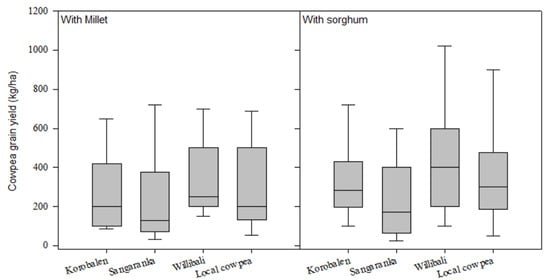 Although cowpea is of vital importance to the livelihoods of most Malian farmers, we found that whether with millet or sorghum, cowpea yields were low, and 75% of the yields were less than 500 kg/ha. This result is similar to that of [], supporting that cowpea grain yields in farmers’ fields can be below 300 kg/ha.