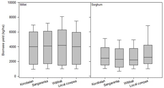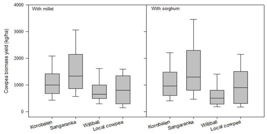 For cowpea biomass, there was great variability depending on varieties (Figure 2). Distribution showed that 75% of the biomass yield of korobalen and the local variety was below 1400 kg/ha, while for the sangaranka yield, distribution was higher and varied from 900 kg/ha to 2200 kg/ha. Cowpea biomass yield obtained with wilibali varied less (500 kg to 1000 kg/ha). Statistical analysis indicated that the best biomass yield was obtained with sangaranka, which was significantly higher than that obtained with korobalen, wilibali, or the local variety, with a difference of 482 kg/ha, 820 kg/ha, and 721 kg/ha, respectively (Table 3). Comparing grain yield to biomass showed that biomass yield of cowpea was statistically higher than that of grain yield (p < 0.05). Interaction between grain and biomass yield with cowpea varieties was significant, indicating that performance of grain or biomass yield depends on cowpea varieties. Thus, under intercropping with millet, the cowpea grain yield obtained with the wilibali variety was statistically higher to that with sangaranka while its biomass yield was significantly higher compared to that of wilibali.