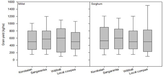 In the study area, soil fertility is low, including low organic carbon and especially P deficiency, which may limit cowpea yield through growth limitation and impaired pod formation and N fixation []. We found high variability in yield whether with millet, sorghum, or cowpea varieties. This can be due to agricultural practices variability, which may depend on farm resource endowment status. A farm with appropriate equipment can benefit more from the first rain for earlier planting, while a delay in planting, especially with a low resource farm type, may result in significant yield penalty. Furthermore, variability in soil fertility management across the region can also result in yield variations as can biotic factors such as the presence of trees, which varied from 10 to 40 trees per farm ha depending on field topographic position [].