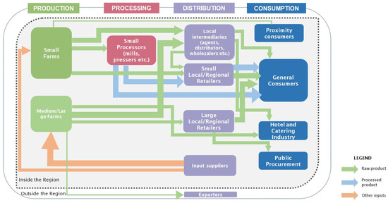 Flows connecting the different nodes (production, processing, commercialisation, and retail) in the regional food system