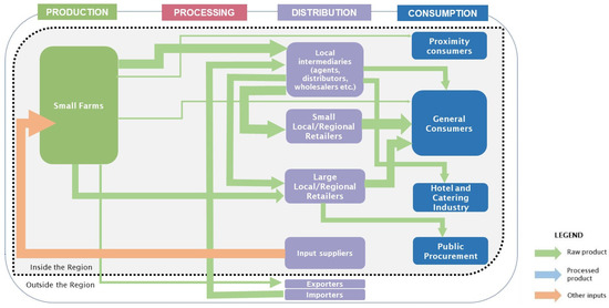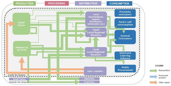 We look at food systems as territorially based at the spatial level of reference regions, which are embedded in local areas with a set of dynamic interactions between households, enterprises, institutions, and ecological, spatial, biophysical, and technological elements. As suggested by the different studies, we take into account part of the proportion of local production that may be connected to global value chains or to the regional market or remain locally at both formal and informal levels. Therefore, we consider market, informal, and hybrid relationships to be relevant to farm connections. The different levels can range from subsistence agriculture to small farms that can depend entirely on the market to guarantee their food needs.