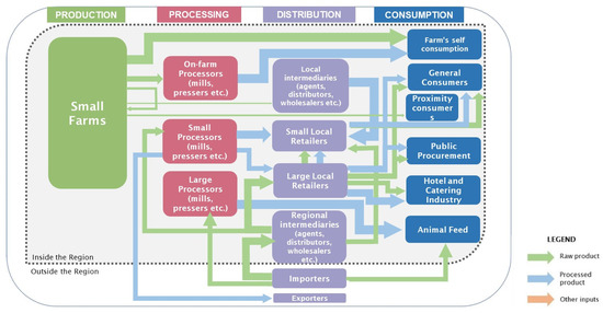 From what was just argued, it follows that beyond the need of quantitative thresholds for the definition of “smallness”, the observation of small farms must consider the relational patterns they establish with the food system. From this perspective, a small farm can be seen as a farm who needs to engage in specific forms of relation (cooperation, informality, farm-household connections) in order to achieve goals that would otherwise be difficult for them to get. This leads us to consider the concept of food system [55].