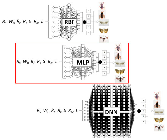 Structures of the generated Artificial Neural Networks (RBF, Multilayer perceptrons (MLP and Deep Neural Networks (DNN) are presented in Figure 2.