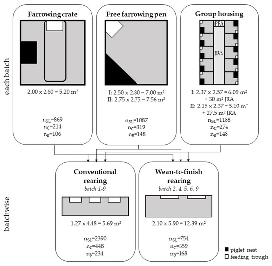 The study was conducted on the research farm Futterkamp of the Chamber of Agriculture of Schleswig-Holstein in Germany. In nine batches between May 2016 and March 2018, in total 3144 crossbred ([Landrace × Large White] × Piétrain) weaning pigs (26.45 ± 0.97 days of age) were included in a 3 × 2 × 2 factorial design study from three different farrowing systems: (1) conventional single-housing in farrowing crates (FC; n = 869), (2) single-housing in free-farrowing pens (FF; n = 1087), and (3) group housing of lactating sows (GH; n = 1188) (Figure 1).