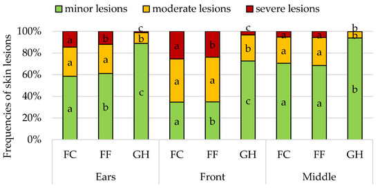 Animals raised in the single-housing systems (FC and FF) had a significantly higher incidence of skin lesions than animals raised in GH (p < 0.05; Figure 2). For all three body parts, GH piglets differed significantly from FC and FF piglets (p < 0.05).