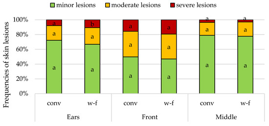 Estimated frequencies (%) of skin lesions per body part and rearing system on the first day after weaning (conv: conventional rearing pen; w-f: wean-to-finish rearing pen; a,b: different letters indicate significant differences within body part and score level (p < 0.05)).