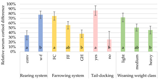Estimated relative difference of serum cortisol before and after weaning, in percent, for the fixed effects rearing system, farrowing system, tail-docking, and weaning weight class (least square means with standard error bars; conv: conventional rearing pen; w-f: wean-to-finish rearing pen; FC: farrowing crate; FF: free farrowing pen; GH: group housing of lactating sows; a,b: different letters indicate significant differences within the tested effect (p < 0.05)).