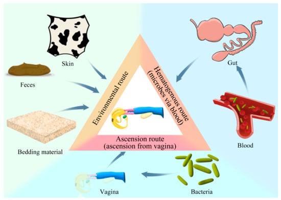 However, the association between Coxiella and uterine pathogens means that uterine pathogens can also be transferred to the lumen of the uterus by monocytes. Though microbes in the gut have been found in blood leukocytes in middle-lactation cows, uterine pathogens have not been detected in all cows [25]; hence, shortly after calving, the presence of uterine pathogens in blood leukocytes should be studied. These different possible origins of bacteria entering the bovine reproductive tract either through the ascension path (ascend via the vagina), environmental route (i.e., via feces, bedding material, animal skin, etc.), or, finally, through the hematogenous route (via blood) of bacterial transmission from the gut to the uterus is depicted pictographically in Figure 1.