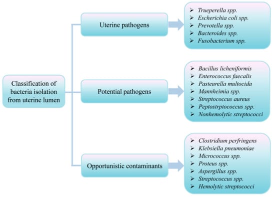 Similarly, the findings of Chen and colleagues [5] indicated a continuity of the microbiota along the female reproductive tract, suggesting that the environment was non-sterile. For that reason, we can assume that the uterine flora and the local immune system have a cross-regulating effect [50]. Fluorescent probes that image bacteria and 16S ribosomal RNA sequencing of the endometrium have provided evidence that a sparse microbiota still exists in the uterus even during pregnancy [51,52]. Bacteria recognized in these studies include endometrial pathogens such as T. pyogenes, Fusobacteria species, and Prevotella spp as previously described. Nonetheless, the uterine microbiota is far less abundant than that of the gut or vagina in terms of its microbial composition, and only a small part of this bacterial load contributes to postpartum uterine disease. However, other studies [53,54] disagree with this information, and the difference in the methods used and the breeds of cattle could explain these conflicting results. However, the bacteria related to the uterus, irrespective of the cow’s health, have been revealed to comprise the leading representatives at the phylum level as Proteobacteria, Tenericutes, Firmicutes, Bacteroidetes, Fusobacteria, Actinobacteria and Unassigned taxa [54], as previously described in the vagina and cervical niche but in greater diversity in the uterine niche (Figure 2). This may be attributed to the dispersal and mixing of vaginal and uterine microbial communities due to the compartmentalization loss in the reproductive tract upon calving [55]. These various bacteria usually contaminate the uterine lumen of early postpartum dairy cows [44], and they can be classified as opportunistic pollutants, potential pathogens, and uterine pathogens according to their potential pathogenicity [56], as shown in Figure 3.