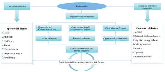 Chart for subclinical and clinical endometritis and its risk agents. Some risk agents are particular for one kind of endometritis, but primarily, their interactive relationships with other risk agents turn endometritis into a disease that is multifactorial [75]
