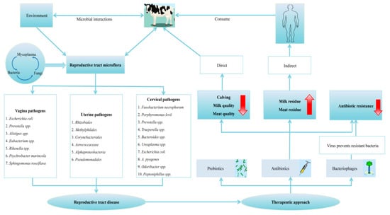 The reproductive tract microflora interactions in health and disease. Isolates of microbial flora from cervix, vagina, and uterine flora and their interactions with the host animal and environmental factors. Several determinants are also involved in the association of this microflora with various antimicrobials’ influence. In addition, information on the factors that facilitate antibiotic resistance in the host animal and indirectly affect human health through meat/milk residue after antibiotic administration in the host animal is elucidated. Specific isolates of probiotics and their natural products have shown promise as alternatives for therapeutics, including no side effects and the reversal of immunosuppression, while bacteriophage has also been explored for its ability to attack pathogenic bacteria, thereby limiting antibiotic resistance. RED arrows indicate whether there is an increase or decrease in presence or virulence [105,106,107].