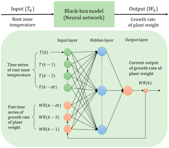 One useful approach to identifying a black box system is artificial neural networks (ANNs) [23]. ANNs are an information-processing approach inspired by the biological neural system. Artificial neural networks can identify a complex system without requiring prior knowledge of the relationships among the parameters within the system by learning from its input–output signals [24,25,26]. With these capabilities, artificial neural networks are useful in handling uncertainties and non-linear relationships [23]. Moreover, artificial neural networks are a general-purpose approach to dealing with such a complex system. Not only effective for non-linear regression, artificial neural networks are also useful for other applications such as classification, clustering, pattern recognition, and forecasting. Further, analysis using artificial neural networks does not require restrictive assumptions about the data (non-parametric), which makes this approach flexible to use [23]. These properties make artificial neural networks superior to other statistical methods in the identification of a complex system [26]. Given this ability, artificial neural networks have high potential to successfully identify the complex eco-physiological process of plants. In the agricultural sector, the artificial neural network technique has been extensively developed in various applications [9,27,28]. Hence, system identification using the artificial neural networks mentioned above may be useful in constructing a model of the dynamic response of plant growth to RZT.