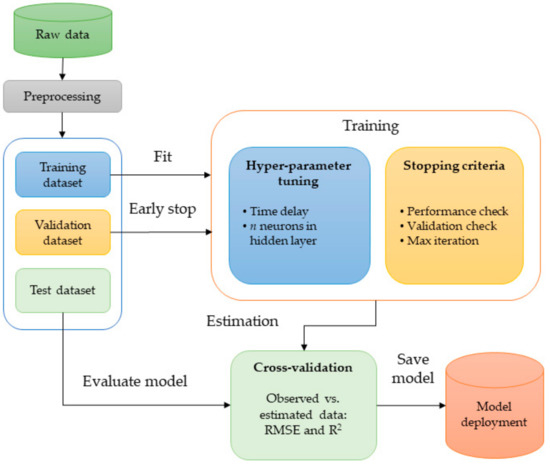 To obtain sufficient accuracy of the identified model, data for identification were divided into three independent datasets: training, validation, and test [48]. The training dataset was the sample of data used by the learning algorithm to fit the model. The trained model was then evaluated using the unbiased validation dataset while tuning the model parameters. During the training process, the validation dataset was also used for regularization by the early stopping training process to prevent model overfitting when generalization was not improving [46]. Four patterns of observation datasets were used for the training and validation datasets, with the proportions of 75 and 25%, respectively. This means that in each dataset, as many as 45 and 15 days of data were used for training and validation, respectively.