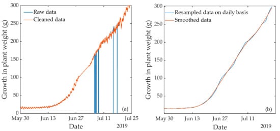The response of plant growth to changes in environmental conditions can be categorized as a long response that can be identified daily. Thus, resampling or aggregation of time series data was needed. In this step, data were resampled on a daily basis using the averaging procedure and then smoothed using the Savitzky–Golay filter [39]. All data preprocessing was performed using the Matlab® Signal Processing Toolbox™ R2019a (MathWorks® Inc., Natick, MA, USA).