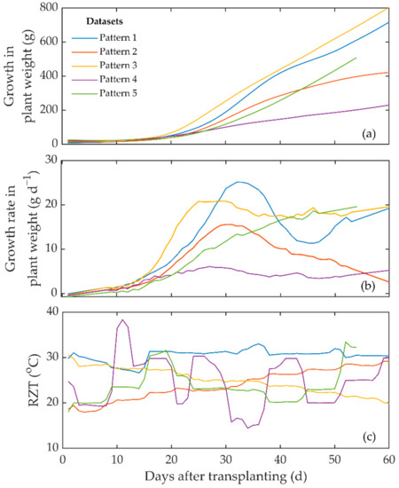 Figure 5 shows daily changes in plant weight, the growth rate of plant weight, and the RZT of hydroponic cultivation for 60 days of observations, which started at 35 days after seeding. These 60 days of observation correspond to the initial stages of pepper plant growth. The data on plant weight are the average values of three pepper plants. Typical patterns of the growth in plant weight under five different RZT treatments are shown. For Pattern 5, however, data were obtained up to only 55 days because of a faulty sensor that produced unreliable records.