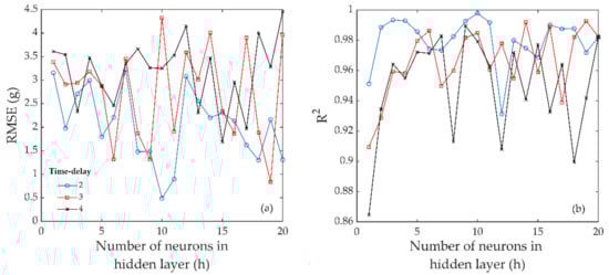 The relationship between the time-delay order (dt), the number of neurons in the hidden layer (h), and model performances: (a) root-mean-squared error (RMSE) and (b) R2.