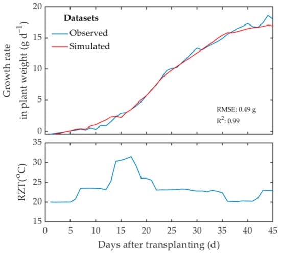 The performance of the identified neural network model was evaluated by comparing the estimated values and the independent test dataset with the observed values. Figure 7 shows a comparison of the estimated dynamic response calculated by the neural network model and the observed response for the growth rate of plant weight. With RMSE and R2 values of 0.49 g and 0.99, respectively, it was found that the estimated response closely correlated with the observed response.