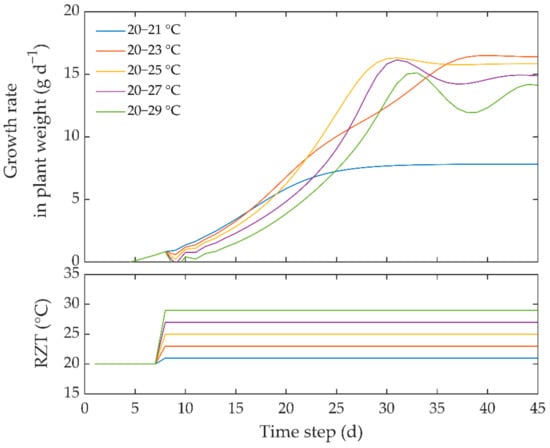 In previous studies, the examination of dynamic plant growth control using root zone environmental factors in hydroponic cultivation was limited to nutrient solution concentration [16]. Meanwhile, optimal temperature control of the root zone environment, which is one of the essential determining factors in hydroponic cultivation, had not been thoroughly investigated [18]. Identification of the dynamic responses of plant growth as affected by RZT, which was conducted in this study, may be useful for a better understanding of plant growth control in plant production systems.