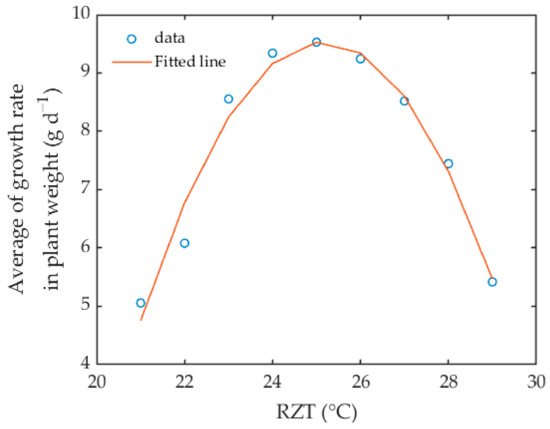 In order to confirm the relevance of the model in this study, the estimated relationship between RZT and the average growth rate in plant weight, which also represents plant growth, was examined via model simulation. Figure 9 shows the estimated static relationship between RZT and the growth rate of plant weight. The estimated value of the growth rate of plant weight was obtained from the average of the step response calculated using the identified model, where the step input value was set as stationary from various values. From the simulation, it can be seen that the growth rate of plant weight increased with RZT. However, above the range 25 to 26 °C, the growth rate tended to decrease with RZT. In general, it was found that the relationship between RZT and the growth rate of the plant showed strong non-linearity and peaked in the range of 24 to 26 °C. This result is consistent with a previous study which reported that the optimal RZT range for bell pepper (Capsicum annum L.) is in the range 25 to 27 °C or less in terms of yield [49] and 24 °C in terms of shoot dry weight [50].