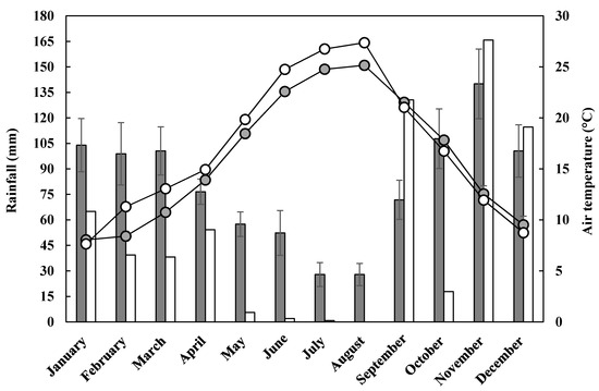 Monthly air temperature (circles) and rainfall (bars). Grey: mean 1996–2016 values; white: 2017 values.