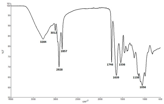 The ATR-FTIR spectra of analyzed samples can be divided into different areas corresponding to specific functional groups: area 1150–1000 cm−1 to stretching vibrations by carbohydrates [21]. The area between 1650 and 1500 cm−1 was assigned the O=C-N-H vibrations (region of proteins), in particular to 1639 cm−1, the band of the amide I, and to 1536 cm−1, the band of the amide II [22]. The band to 1746 cm−1 contains vibrations assigned to lipids groups and C=O stretching [23]. Area 2928 cm−1 corresponded to C-H stretching vibrations that were specific to CH3 and CH2 and the area centered to 3284 cm−1 corresponded to stretching of the N-H groups.