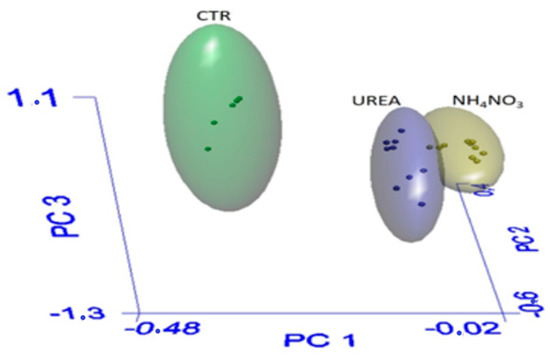 Three-dimensional principal component analysis (PCA) scores plot according with SIMCA algorithm of seeds from hemp plants fertilized by ammonium nitrate (NH4NO3) and urea. CTR, control seeds. PC1, PC2, and PC3 are three independent variables.