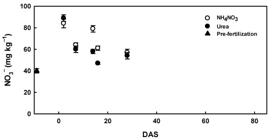 NO3− content in the soil increased after fertilization, which occurred on 19 April 2017. It reached the highest values (about 80 mg kg−1) in all treatments two days after the fertilizer application (2 DAS) and decreased up to about 50 mg kg−1 at 28 DAS. The highest (p < 0.05) content of NO3− in the soil was detected between 14 and 16 DAS in plots fertilized with NH4NO3 (Figure 4).