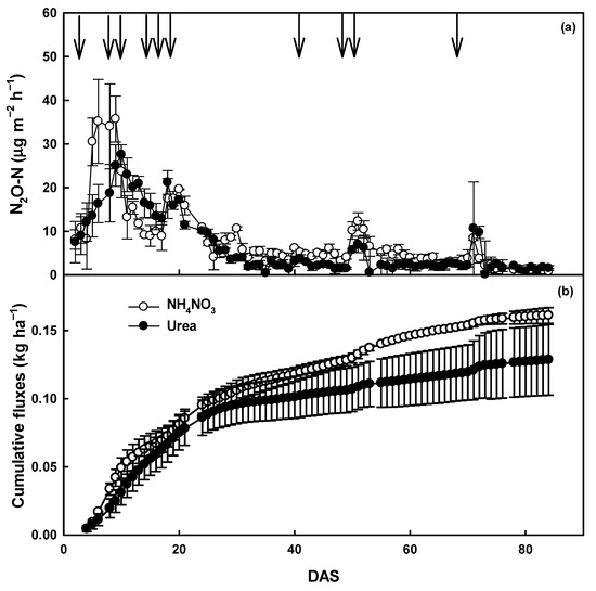 (a) Soil Nitrous oxide (N2O-N) fluxes and (b) cumulative nitrous oxide (N2O-N) from plots fertilized by ammonium nitrate (open circles) and urea (filled circles). The arrows denote irrigation events. Data are means (n = 4) ± SE.