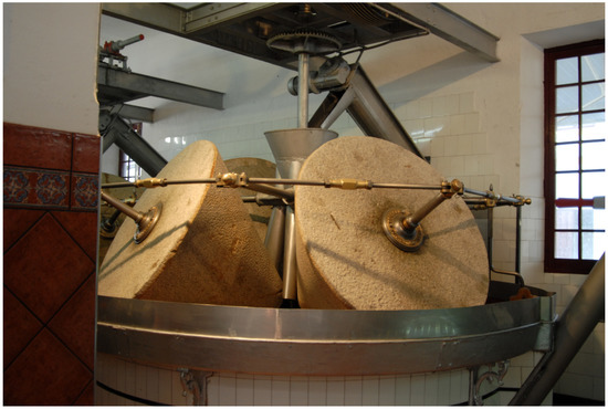On the other hand, the study of olive oil heritage is undoubtedly one of the fields of greatest interest to the world of olive oil [7]. Over the centuries, there have been many methods of obtaining virgin olive oil that have been used, according to a classification between grinding and pressing systems, which also include primitive procedures [8]. Thus, the production of olive oil consisted of a discontinuous procedure where in the first place the olive was ground in the mills and later the ground paste was pressed in the presses to obtain the oily must (mixture of olive oil and “alpechín” or vegetation water), separating the olive oil from the alpechín thanks to the difference in densities in the settling wells of the old oil mills. Currently, this production is produced in modern facilities thanks to a continuous process of extracting olive oil by centrifugation.