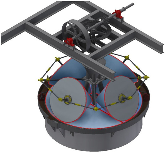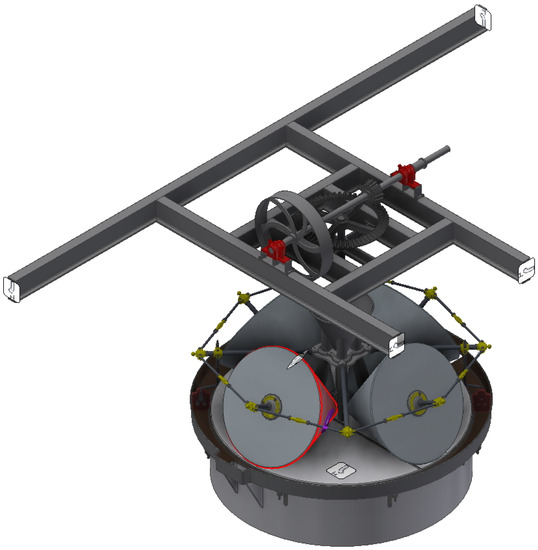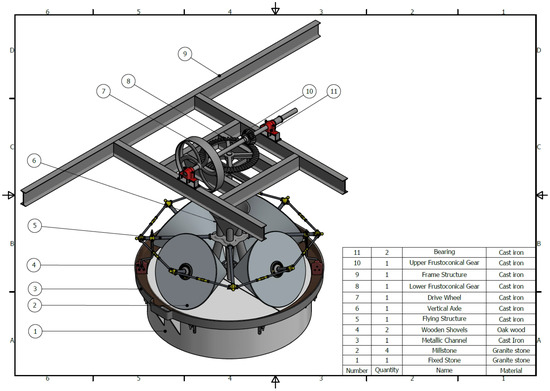 The mill studied here is a complex system since it consists of four conical stones of 2112 kg, which would require a crane structure and an orderly assembly of all its elements. In addition, a perfect fit must be achieved using the adjustments and extenders of the rods of the grinding system, since it was vitally important that the millstones rotate without sliding on the hearth, which affects the quality of the oil obtained. In addition, the movement transmission system is quite simple and manages to take advantage when working at a low number of revolutions, since it was intended to place the friction between the stones and not the grinding speed. Similarly, from the structural point of view, the joints of the inertia flywheel structure present evident disadvantages that at first glance can lead to questioning the design of the mill due to the high number of elements present. The structure that allows the stones to rotate and move alone has 126 elements between rods, nuts, washers, or pins, among others.