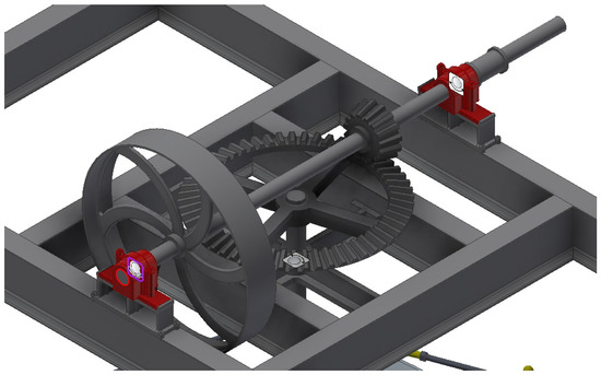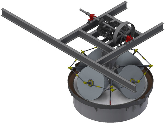 The vertical axle (6) is driven by the upper frustoconical gear (10) attached to a horizontal axle. This gear measures 270 mm in major diameter, 215 mm in minor diameter, 116.5 mm in height, and features 14 teeth. Therefore, the gear ratio between the gears is 7/30. Furthermore, the vertical axle at the end opposite to the upper frustoconical gear has a driving wheel (7) driven by an electric motor through a belt. This driving wheel measures 1.14 m in diameter and like the gear is jointly connected to a horizontal axle. Figure 4 shows an image of the motion transmission system.