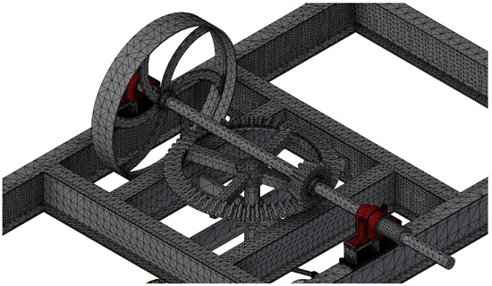 Since the angular speed of the inertia flywheel is approximately 1 rad/s, then the torque applied to the inertia flywheel will be 3.5∙106 N.mm. It is actually based on a hypothesis that is not entirely true, since part of the energy generated in the electric motor is lost in friction and resistance. However, if these data are taken as the maximum achievable torque when analyzing the model, it will be in a situation of von Mises stresses on the safety side (Figure 13).