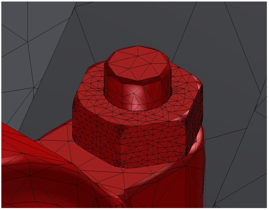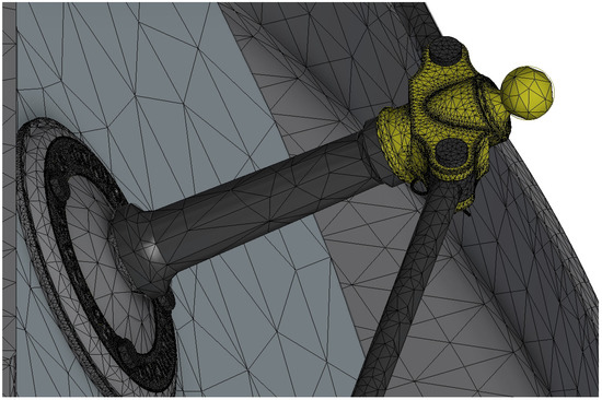 In this study, a tetrahedral mesh was obtained from the default values offered by the software. The average size of the mesh element was 0.1 times the size of the bounding square, its minimum size was 0.2 times that of the average element, and the variability factor between contiguous elements was 1.5. Finally, the maximum angle of rotation between tetrahedral surfaces was 60°. With these parameters, the result of the meshing obtained was precise, fitting correctly to the geometry (Figure 14, Figure 15, Figure 16 and Figure 17).