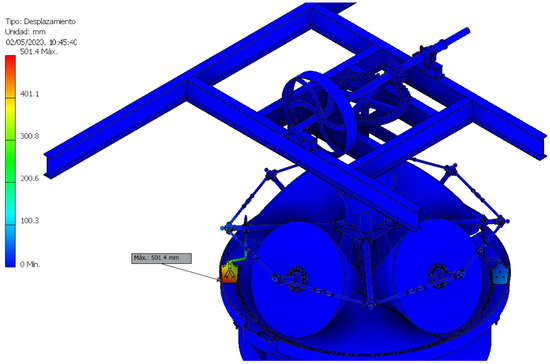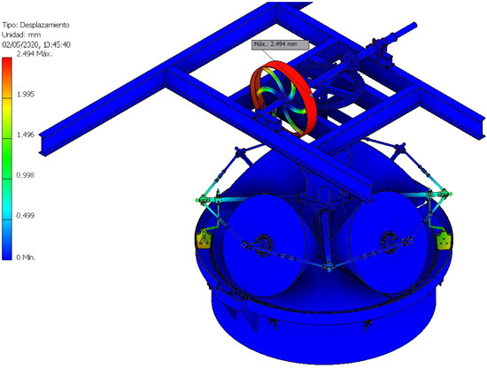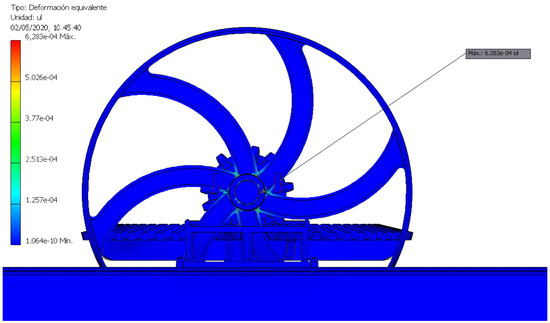 The study of displacements is another very important aspect because an element that suffers a large displacement, depending on its function, can prevent the assembly from working correctly. The model shows how these displacements are particularly delicate in the gears, although the maximum displacement took place in the inertia flywheel and did not reach 2.49 mm (Figure 26), and thus the displacements are negligible throughout the assembly.