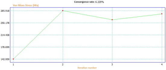 In the FEA, the calculation of the value in each of the mesh nodes affects the nearby nodes, so it usually takes an iteration according to a given convergence criterion. Every time the software finishes calculating a value in each node it recalculates it, but starting from the final value calculated in the previous iteration. In general, if a stop criterion of 10% is established when the difference between the two values is less, the software stops iterating. In the present study, a maximum of eight iteration cycles and a stop criterion of 10% were established for the calculation of von Mises stress. Specifically, the software stopped in the fourth iteration with a convergence ratio of 6.229%, and thus the result was very consistent (Figure 20).