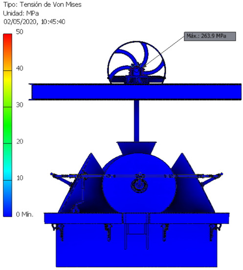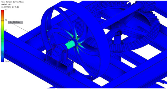 Figure 22 shows the element with the maximum stress (263.9 MPa), which turned out to be the bearing nut where the horizontal axle rests. In addition, we can also appreciate how the stresses accumulated in the areas of the inertia flywheel radii close to the axle, although in this case they did not exceed 50 MPa.