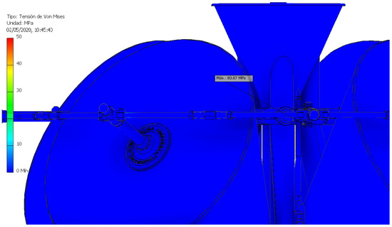 Apart from the bearing nut, the second highest von Mises stress was located on the bar that joins the vertical axle with the blocked millstone, reaching a value of 80.87 MPa (Figure 23). These results were predictable before carrying out the analysis, but it is striking that they were so far from the elastic limit of the material (758 MPa).