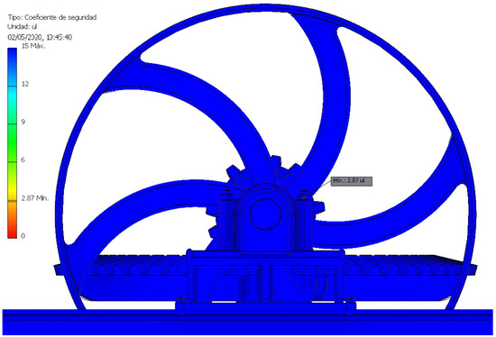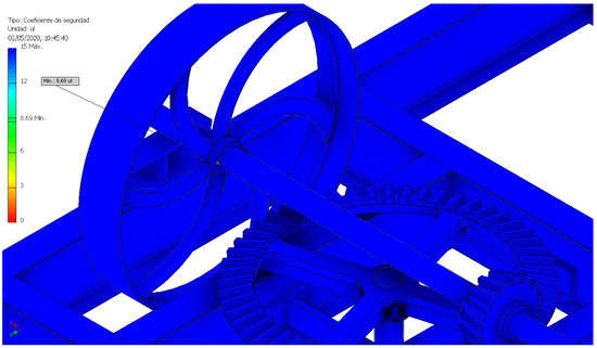 The second point with the lowest coefficient of safety was located at a point between the inertia flywheel and its horizontal axle with a value of 8.69 (Figure 25), indicating that it was very far from its elastic limit. This means that most of the mechanism was oversized and that it would have been possible to redesign a large number of its parts.